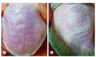 (1大体观察兔耳增厚,表面粗糙,毛孔增大,伴有黄色丘疹